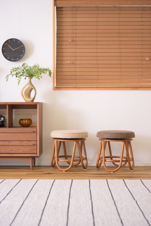 脚にラタンを使用した、軽量の回転スツール。360°くるりと回転するので、狭い場所でも立ち座りがスムーズです。コンパクトなサイズ感で、場所を選ばずお使いいただけます。